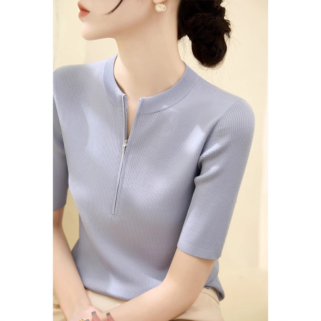 夏の肩の半分の開襟半袖2025ニットの女性の純色のシンプルな新しいファスナーのデザインの薄い上着