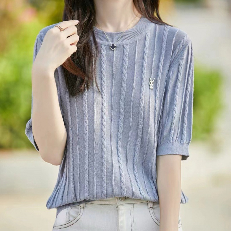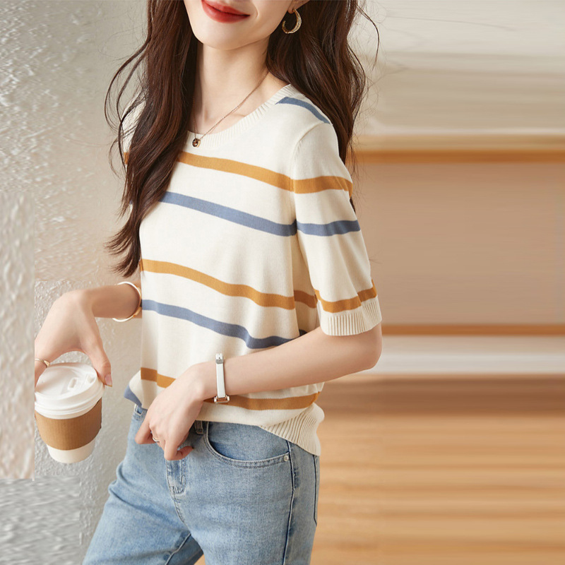 半袖のストライプのニットの女性の夏の新型の薄いタイプはゆったりしていて、やせています。