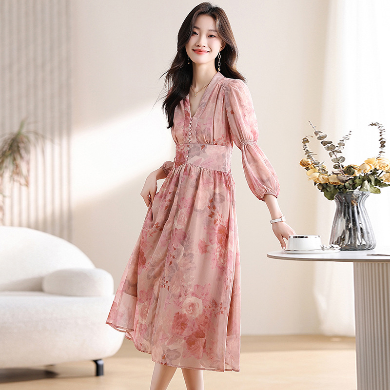 2025春夏の優雅な女性の味のお茶の休みのスカートの優しい風は腰を収めてやせている灯籠の袖のピンクの花のワンピースの女性を現します。