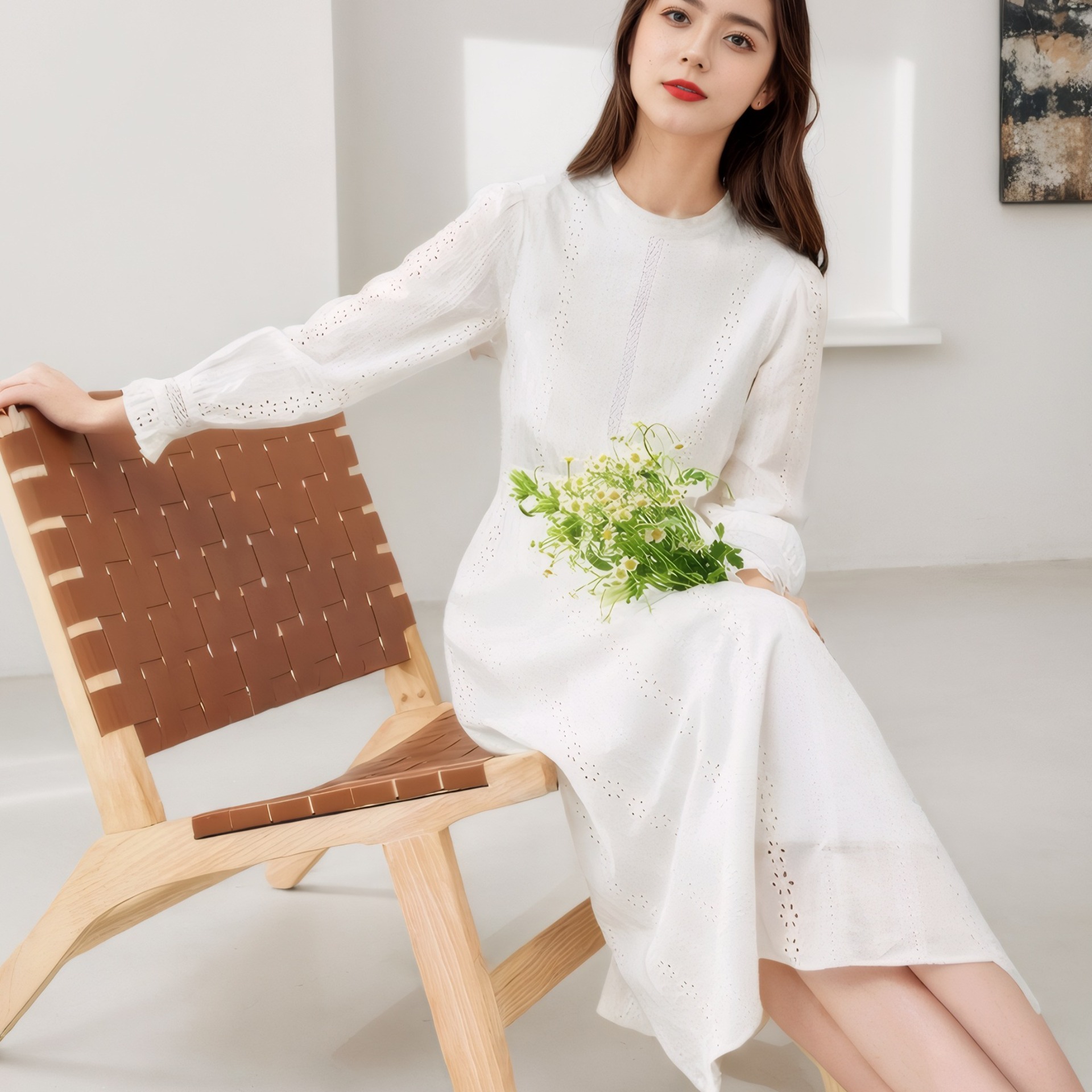 2025春夏新作フランス高級感白ワンピース女性新作透かし彫りウエスト気質ミディアムスカート