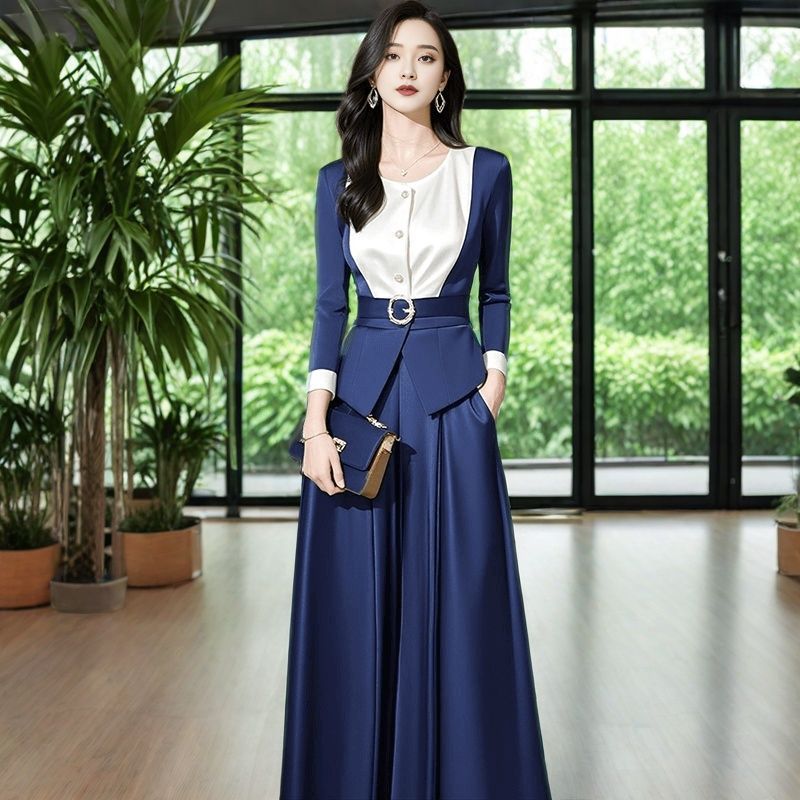 2025春の新型で俊又颯名媛女装高級小香風ブルー上着広脚ズボン職業スーツ