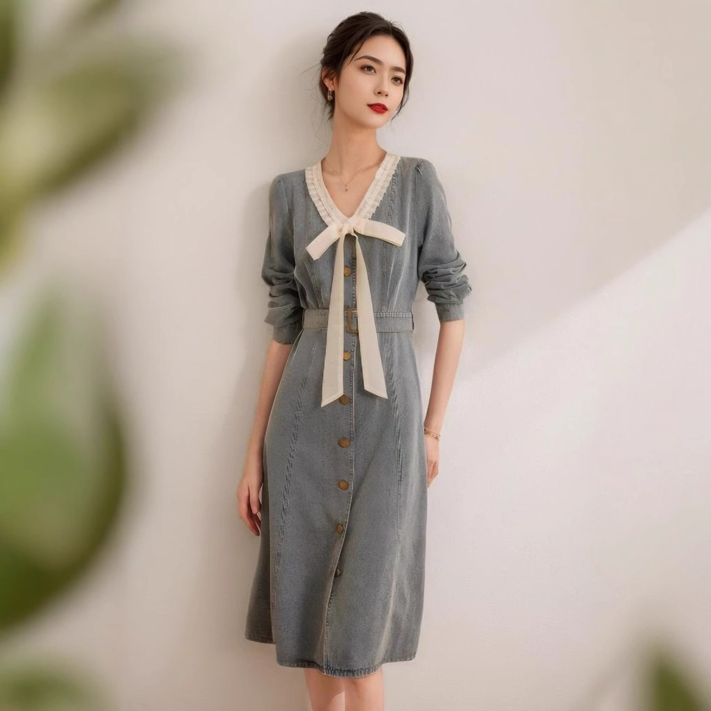 2025春のファッションのリボンの蝶結びの気質の筋理感の長袖の中の長いタイプの弾がない女性のしわのワンピース