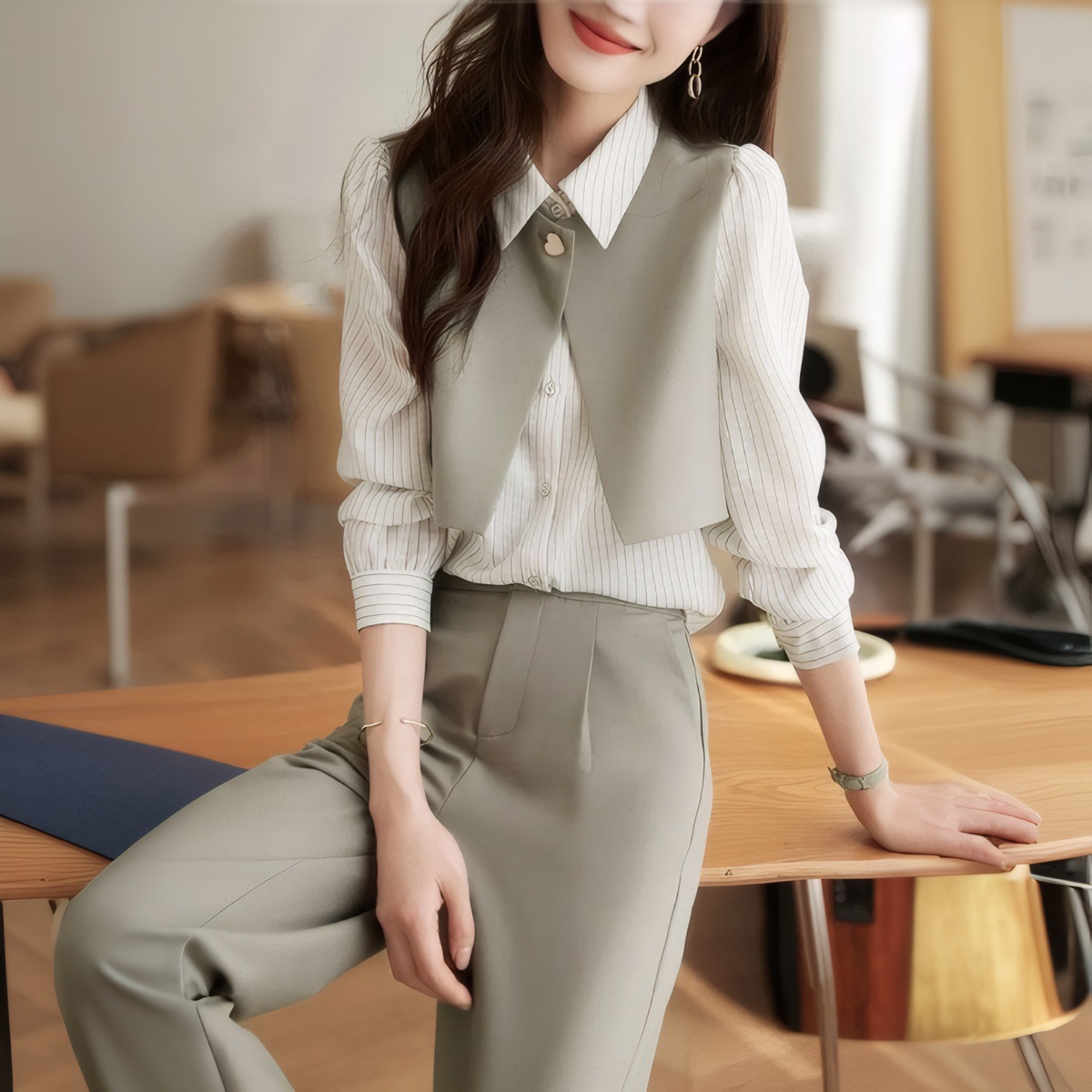 ハイエンドの洋気はストライプの2つのセットをつなぎます。2025春の新型の気質は偽の2つのシャツのスーツのズボンのスーツの女性です。