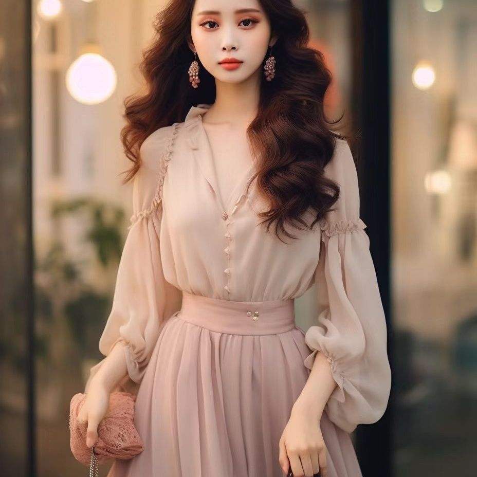 2025春夏には、女性の優しい雰囲気の灯籠袖シャツのスカート雪紡織の2つのセットの女性を着ています