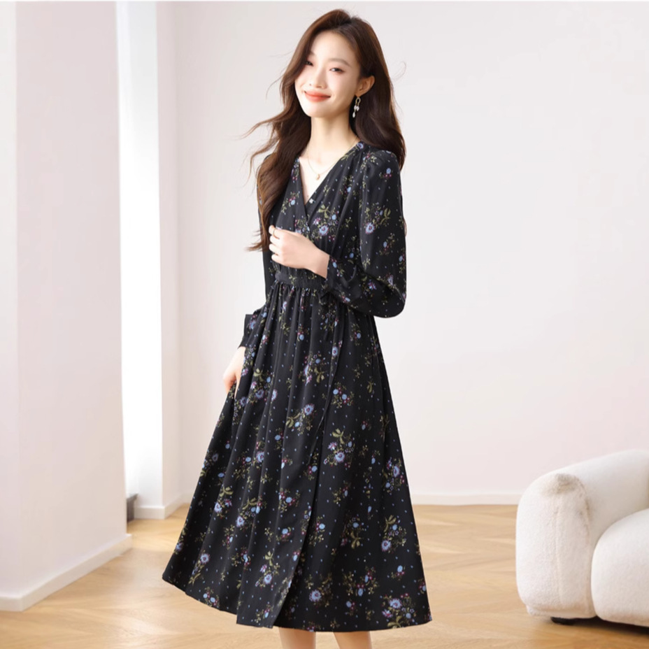 2025フランス式ロマンチックな包み式の花のワンピースの女性の春の長袖のvネックは腰を収めてやせている気質の中で長いスカートを現します。
