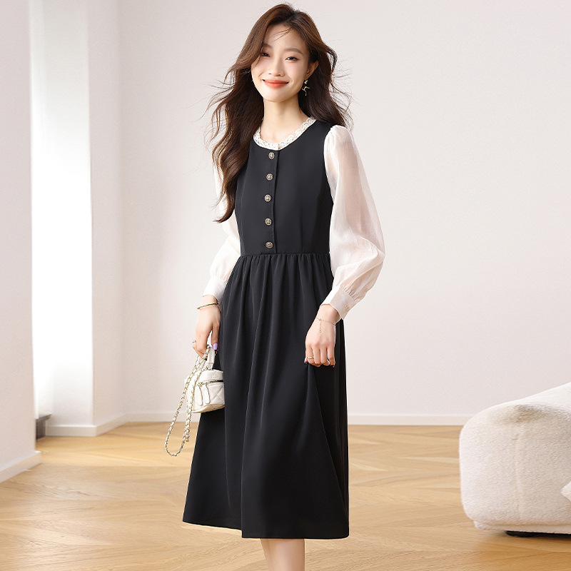 フランス式のワンピースの女性2025の新型の秋の高級感は腰を収めてやせているa字のスカートの気質の中の長いスカートを現します。