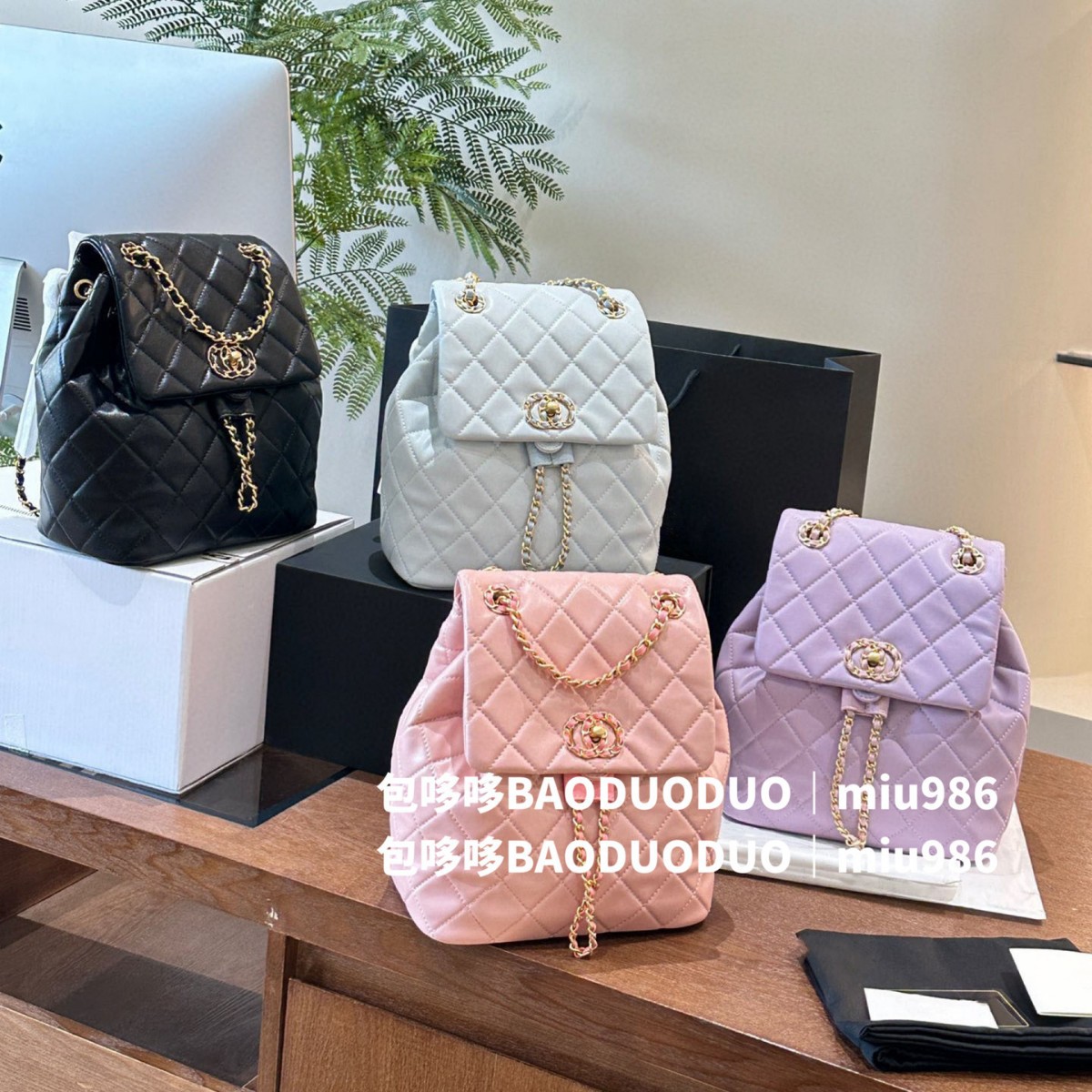 24p新作小香風羊皮黒金リュックサック高級感菱格チェーン女性バッグ大容量手提げリュックサック
