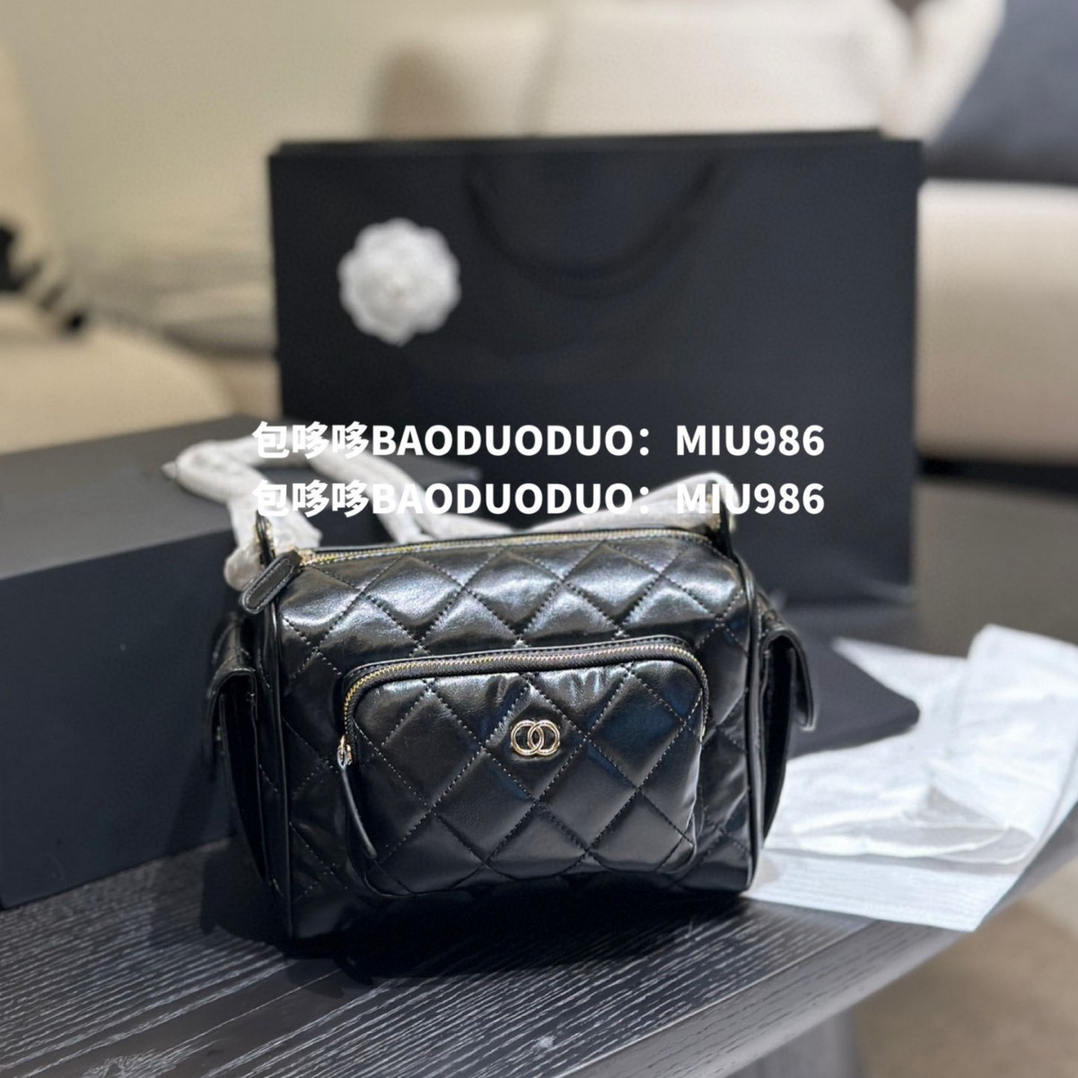 小香風24k秋冬新作レトロ羊皮ポケットカメラバッグ菱格チェーンバッグ真皮脇下ショルダーバッグ