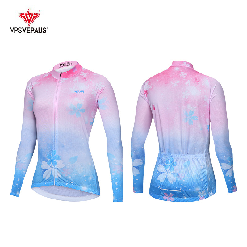 秋の女性の自転車のサイクリング服長袖の青い粉のグラデーションの屋外の通気性の道路のマウンテンバイクのサイクリング服