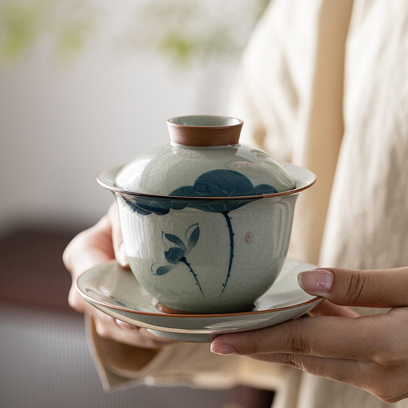 氷片釉薬手描き荷韻蓋碗中国式田園清新魚劇茶碗工夫茶器三才蓋碗