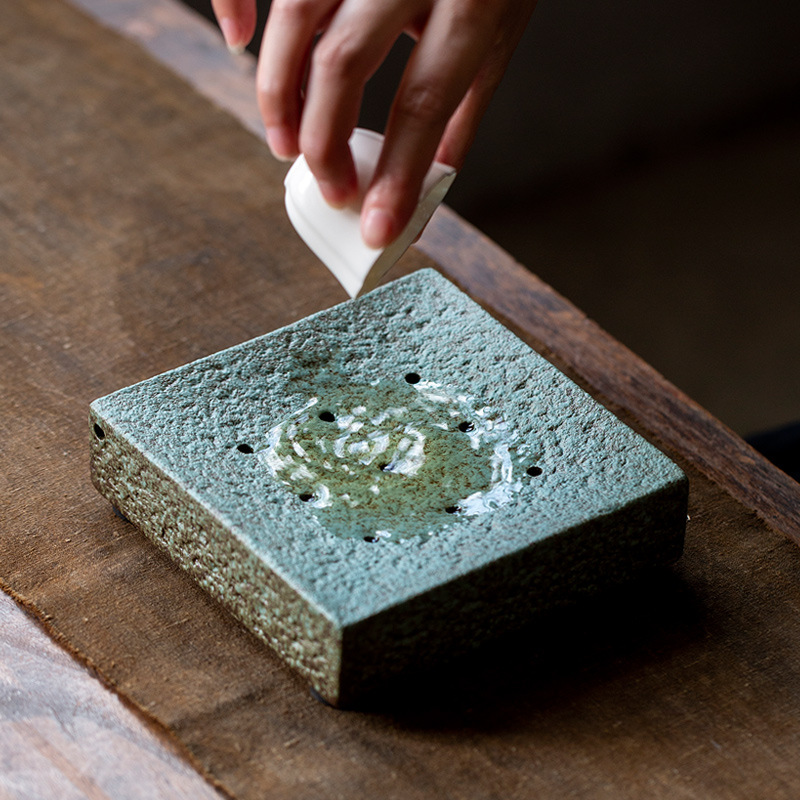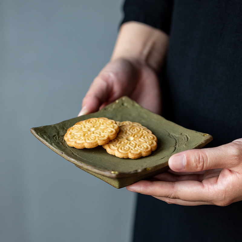 粗陶四方壺は中国式のレトロな味噌の釉薬を受けています。家庭用オフィス茶道の部品のお菓子皿です。