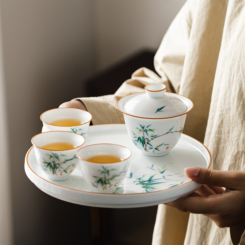 白磁の手描きの竹の蓋の碗の中国式の清新な工夫の茶器の小さいセットの家庭用事務はお茶の碗を浸してお茶を飲みます。