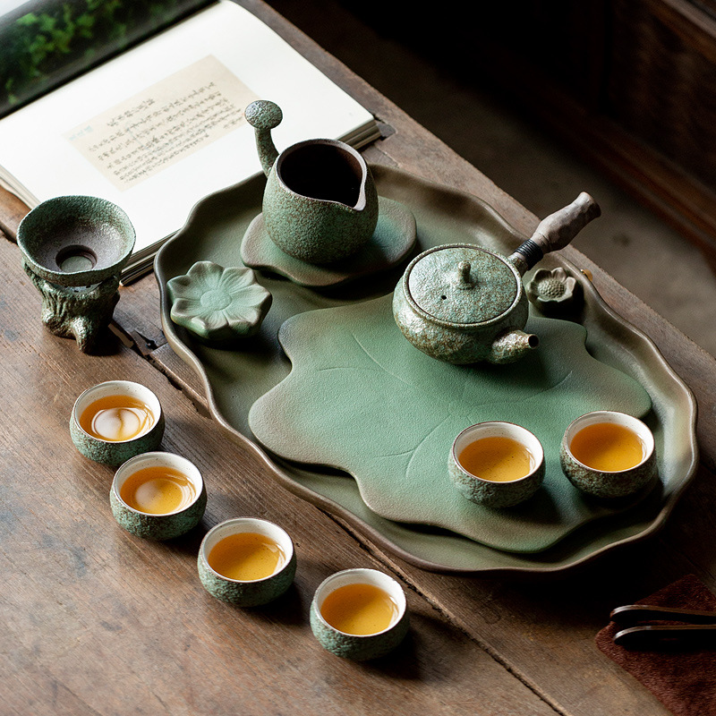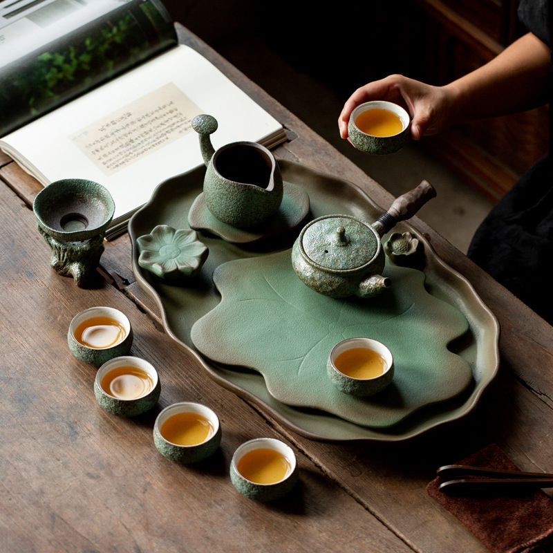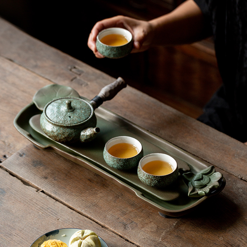 レトロ春色緑荷韻円盤陶磁器茶盤中国式家庭用お茶トレイオフィス排水茶台