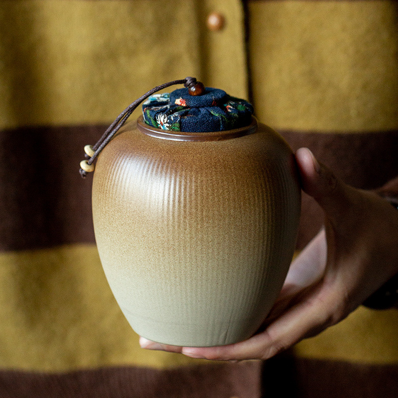 中国風レトロ陶器茶葉入れ、茶色釉薬仕上げ、オフィス用セラミック収納容器、家庭用大型紅茶・緑茶入れ