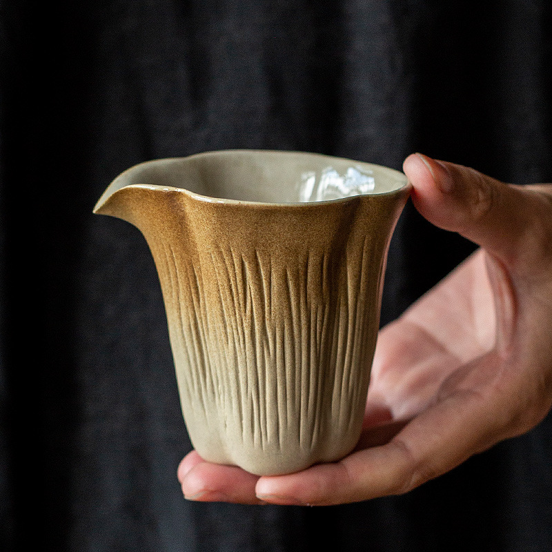 柴ブラウン釉薬縦紋花語公道杯中国式レトロ粗陶分茶器分杯品茗工夫茶器