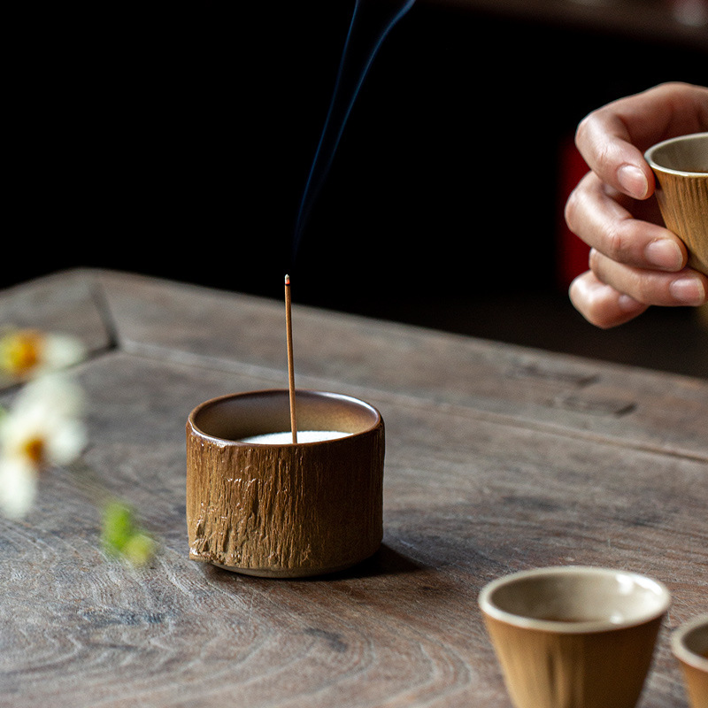 0 レトロな陶器の柴棕釉木柱香立て 家庭用オフィス用線香立て粗陶器中国風竹節香炉