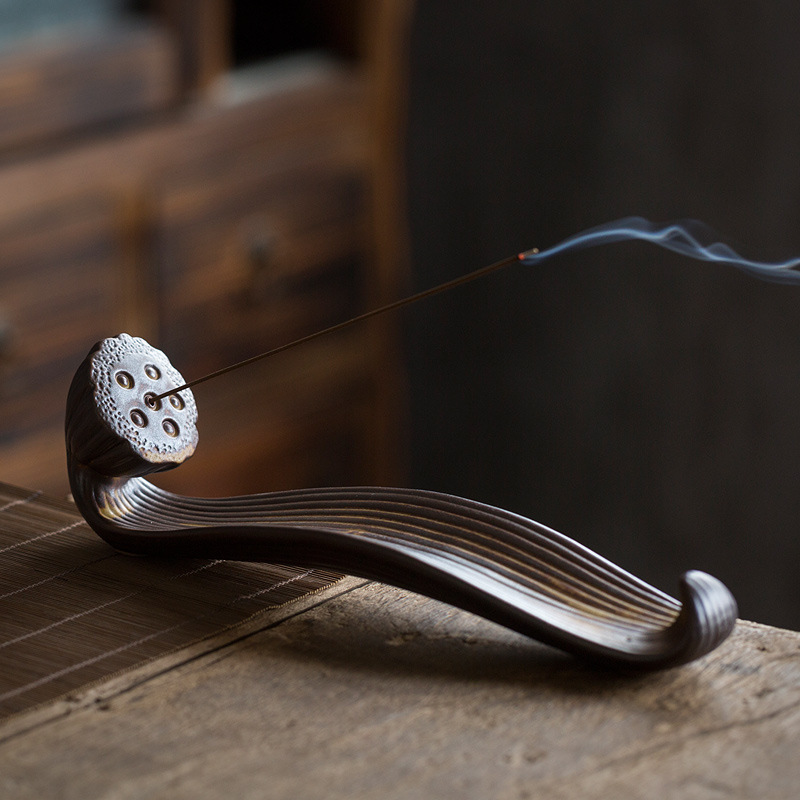 95】手でスイレンの線香をつまんで陶磁器の線香座の香を挿します。