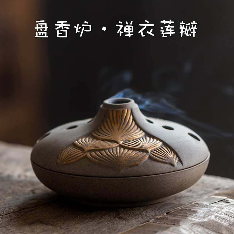 A8】禅衣蓮弁盤香炉陶磁器家庭用白檀炉粗陶復古風禅意薫香炉卸売り