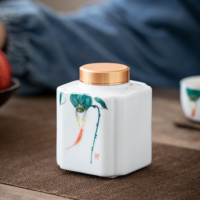 手描き白磁器魚劇蓮蓬亜鉛合金茶葉缶密封茶缶美しいキャンディー缶トランペット花茶缶