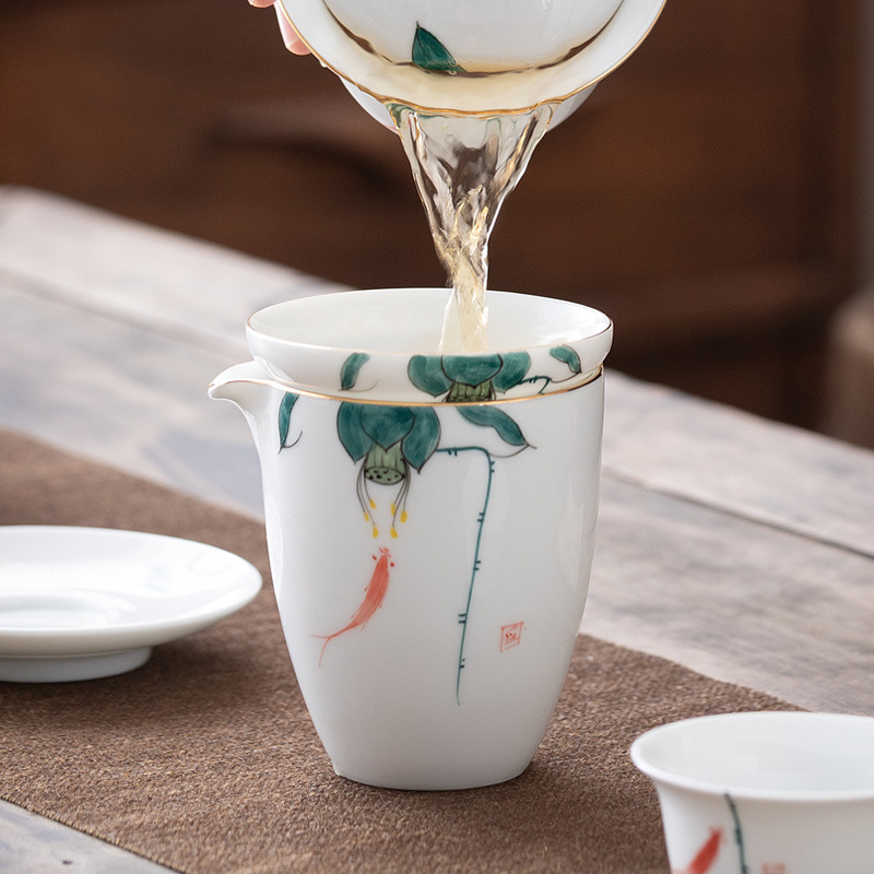 手描きの白磁の魚の劇の蓮の蓬の公道の杯の陶磁器の均等な杯のお茶の海のお茶の杯は茶器のお茶を分けてお茶を漏らします。