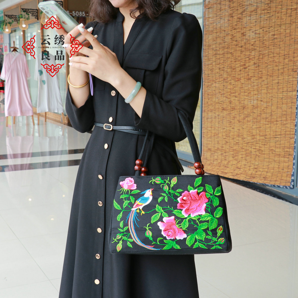 雲奈雲南民族風両面刺繍刺繍二重ファスナーキャンバス角バッグ大容量中高年ハンドバッグ
