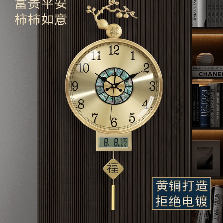 Kaiqin 新中国風全銅壁時計現代電波自動時間設定ライト高級時計サイレント壁掛け中国風時計