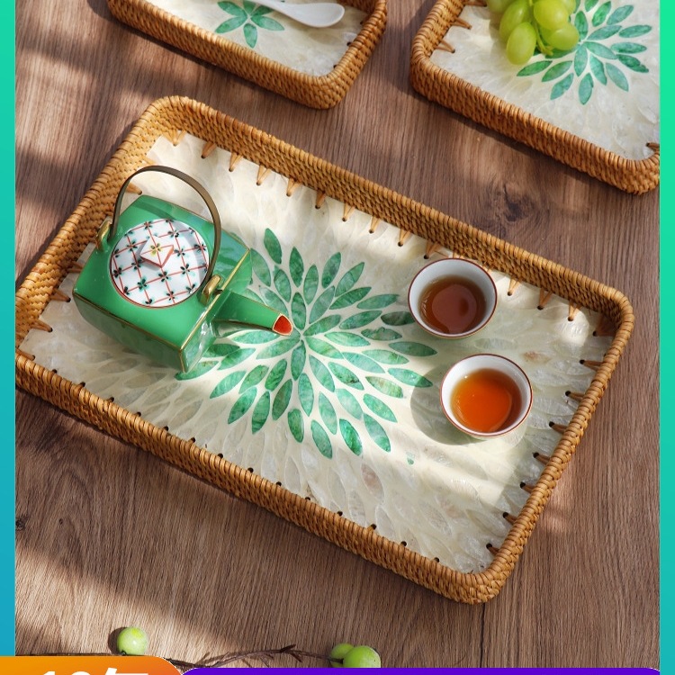 東南アジア輸入手作り籐シェルトレイフルーツトレイホームリビングルームスナック収納ティートレイマザーオブパールスクエアトレイ