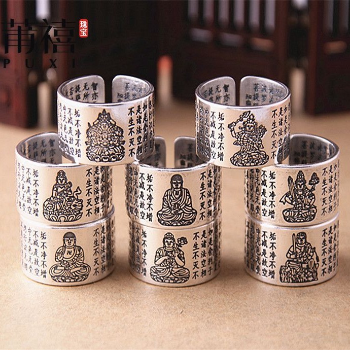 足銀999十二生肖本命仏心経指輪卸売り純銀復古生肖開口男女銀戒