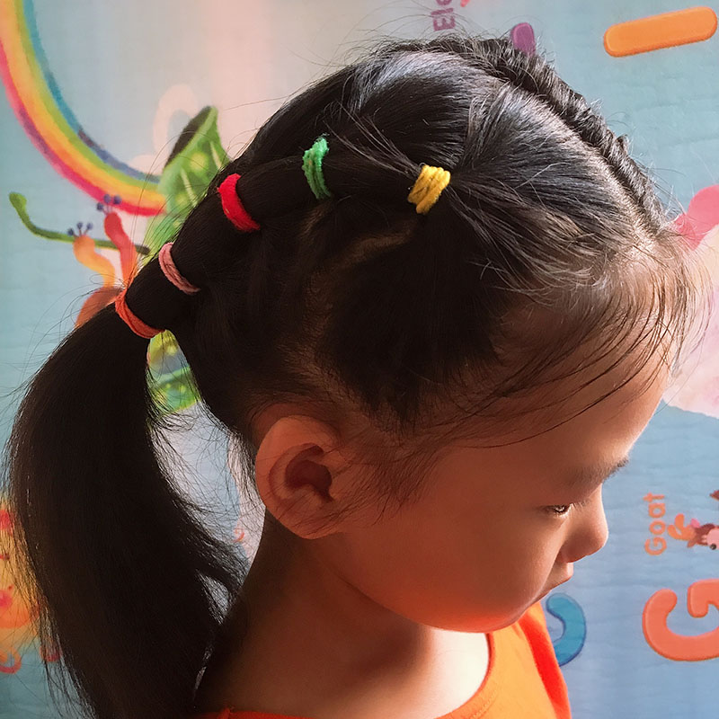 皮筋の赤ちゃんは小さいゴムの子供の髪のひもを編みます。
