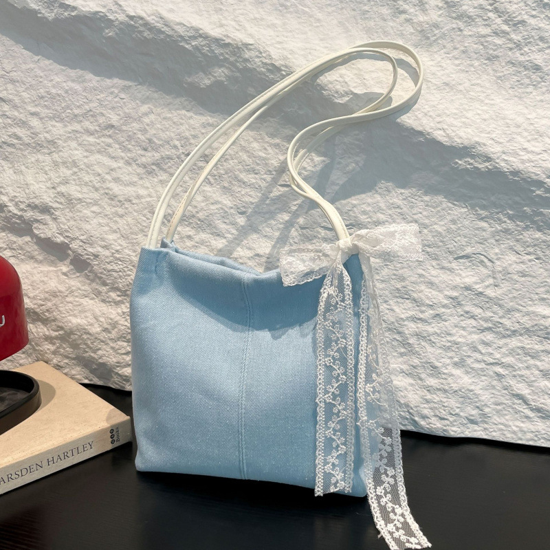 韓国版の甘いシルクスカーフショルダーバッグ女性のための 2025 新しいトレンディな通勤脇の下トートバッグ女性のデニムバケットバッグ