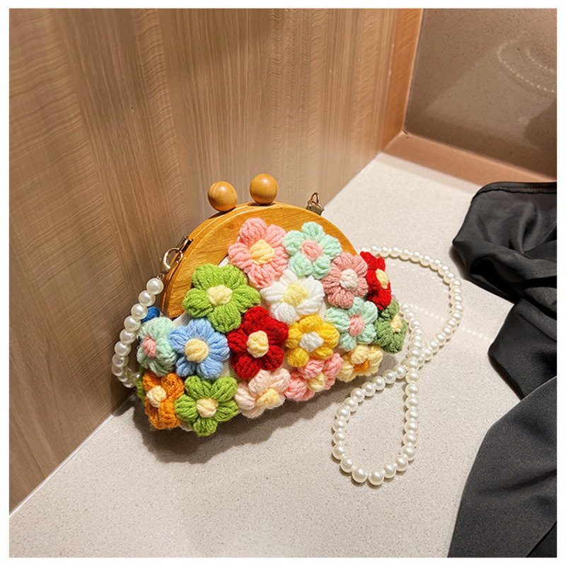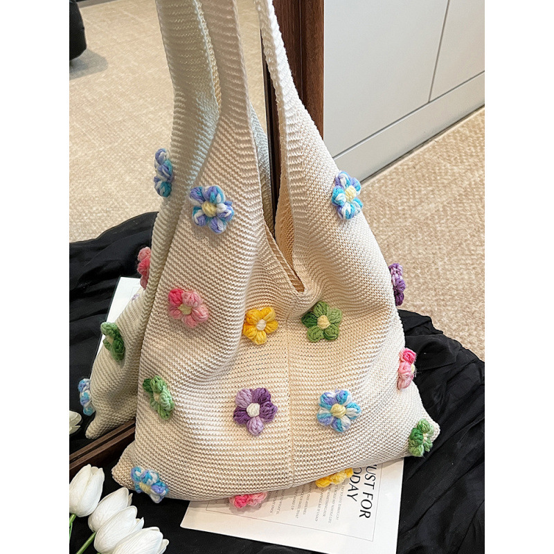 春夏人気のニットフラワーリラックスショルダートートバッグ、レイジースタイル、爽やかで甘い、女性用のシンプルな脇の下バッグ