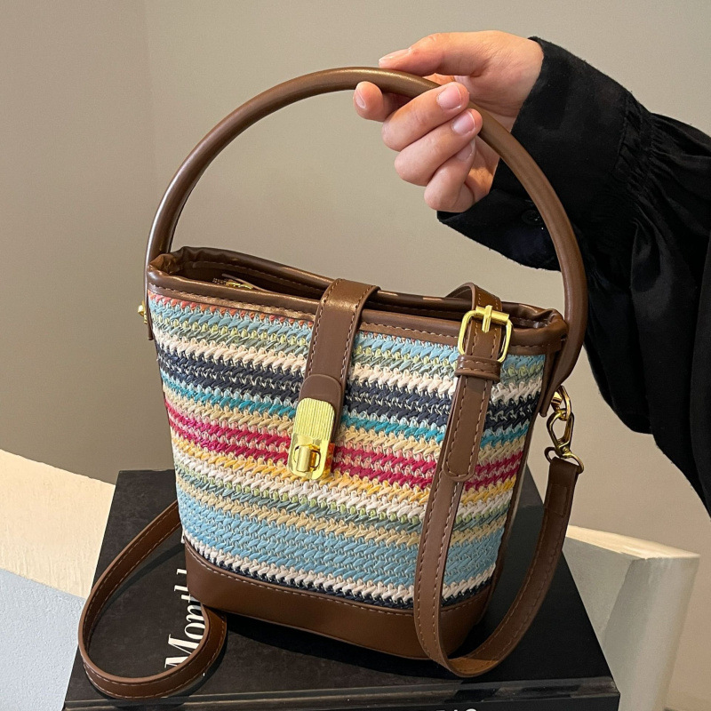 色の編み物の包みの女性の2024の新型の斜めのショルダーのバケツの包みの外出の小さい包みのビーチの休暇の草はわきの下の包みを編みます
