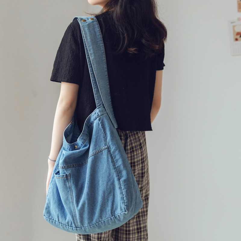 水洗いデニムバッグ大容量斜めショルダーバッグ学生クラスバッグ女性日系キャンバスバッグ韓国版シンプルショルダーバッグ