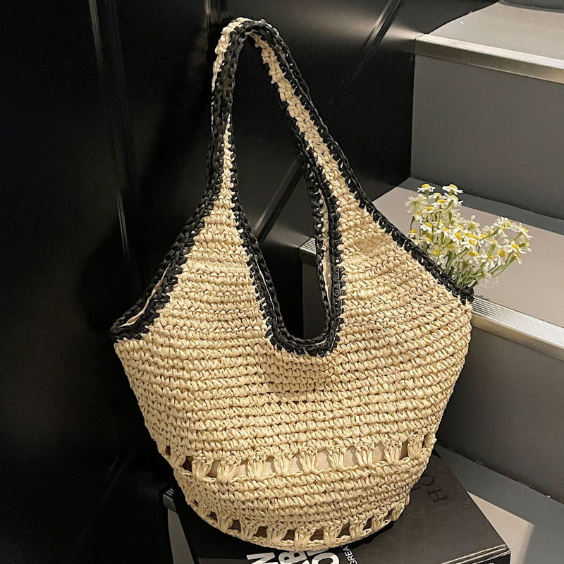 新しいファッション手作りわらハンドバッグ大容量バケットバッグ 2025 韓国スタイルカジュアル休暇ビーチわらバッグ