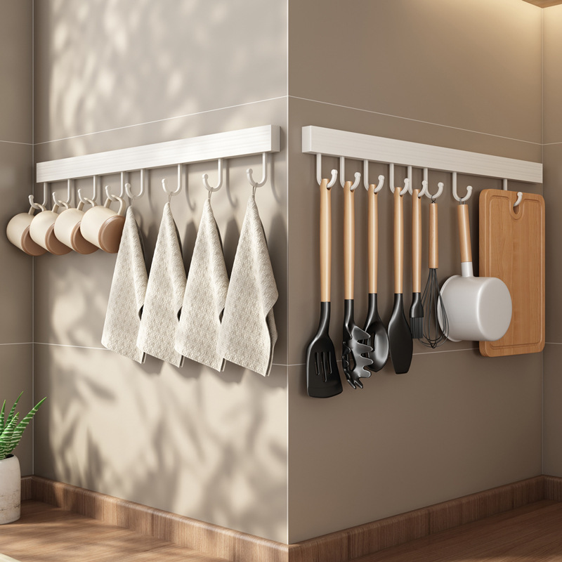 白い台所のフックを掛けて穴を開けない台所の棚の部品の壁掛けの鍋のシャベルの棚のスプーンの調理器具の収納