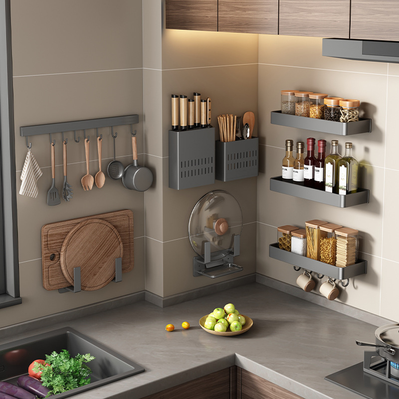 キッチン収納ラック、パンチングなし、ガンアッシュ壁掛けナイフホルダー、調味料用品、家庭用多機能収納ラック