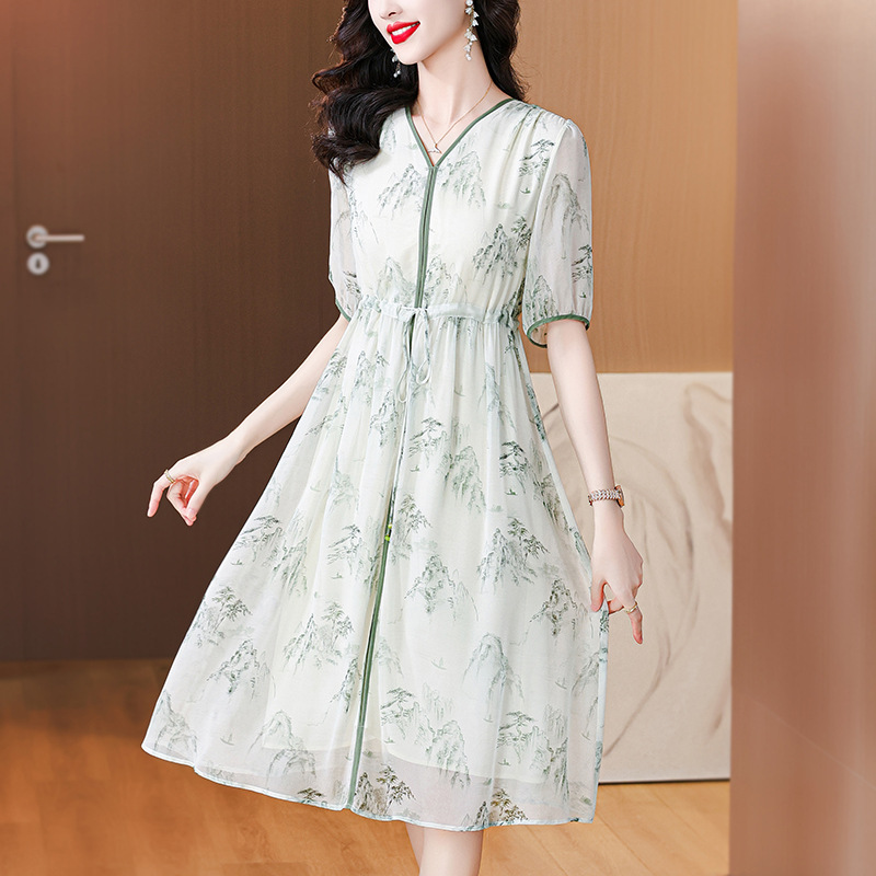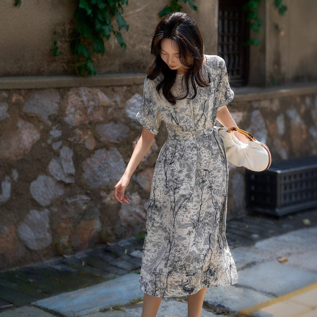 qwfs7588 新中国風インクプリントドレス女性 2025 夏の新ファッション V ネック半袖ミッドレングススカート