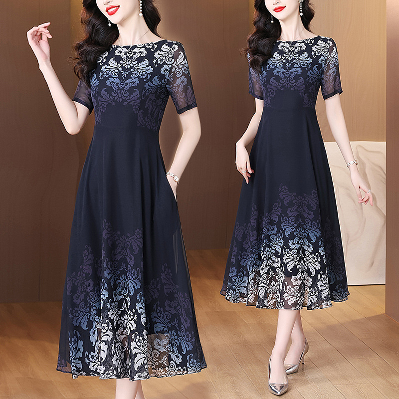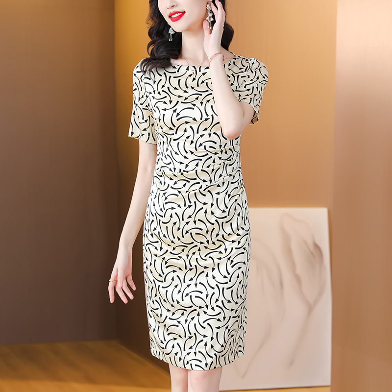 qwfs7732 エレガントなレディプリントラウンドネックスリムドレス女性のための 2025 夏の新しいファッション年齢を減らすスカート