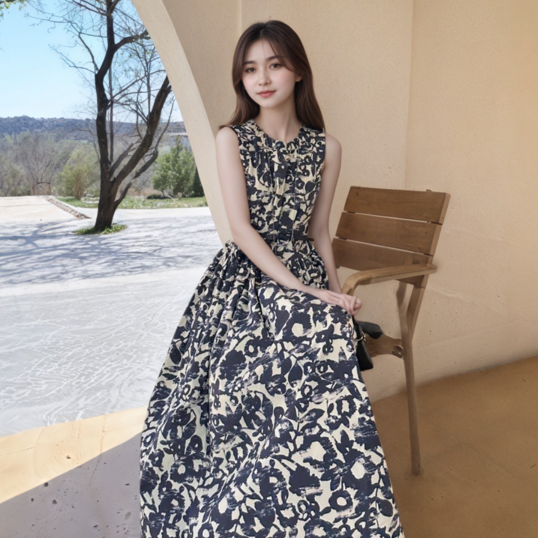 mnm5120 ファッションプリントプリーツウエストノースリーブドレス女性のための 2025 夏の新しい多用途ベストロングスカート
