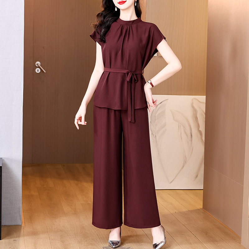 yxfs1012 中高年スーツ 2025 夏ファッション万能着痩せ半袖トップス+ワイドパンツ 2点セット