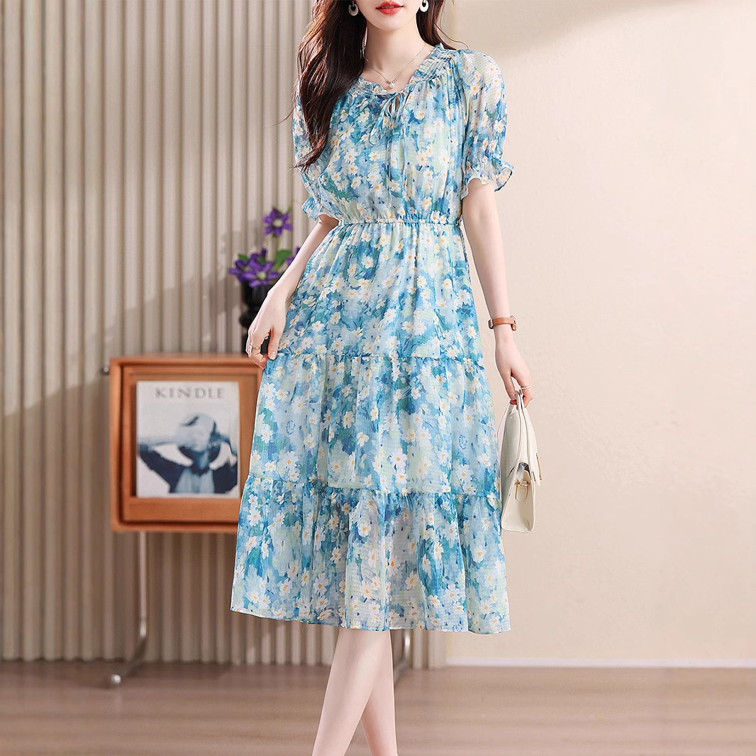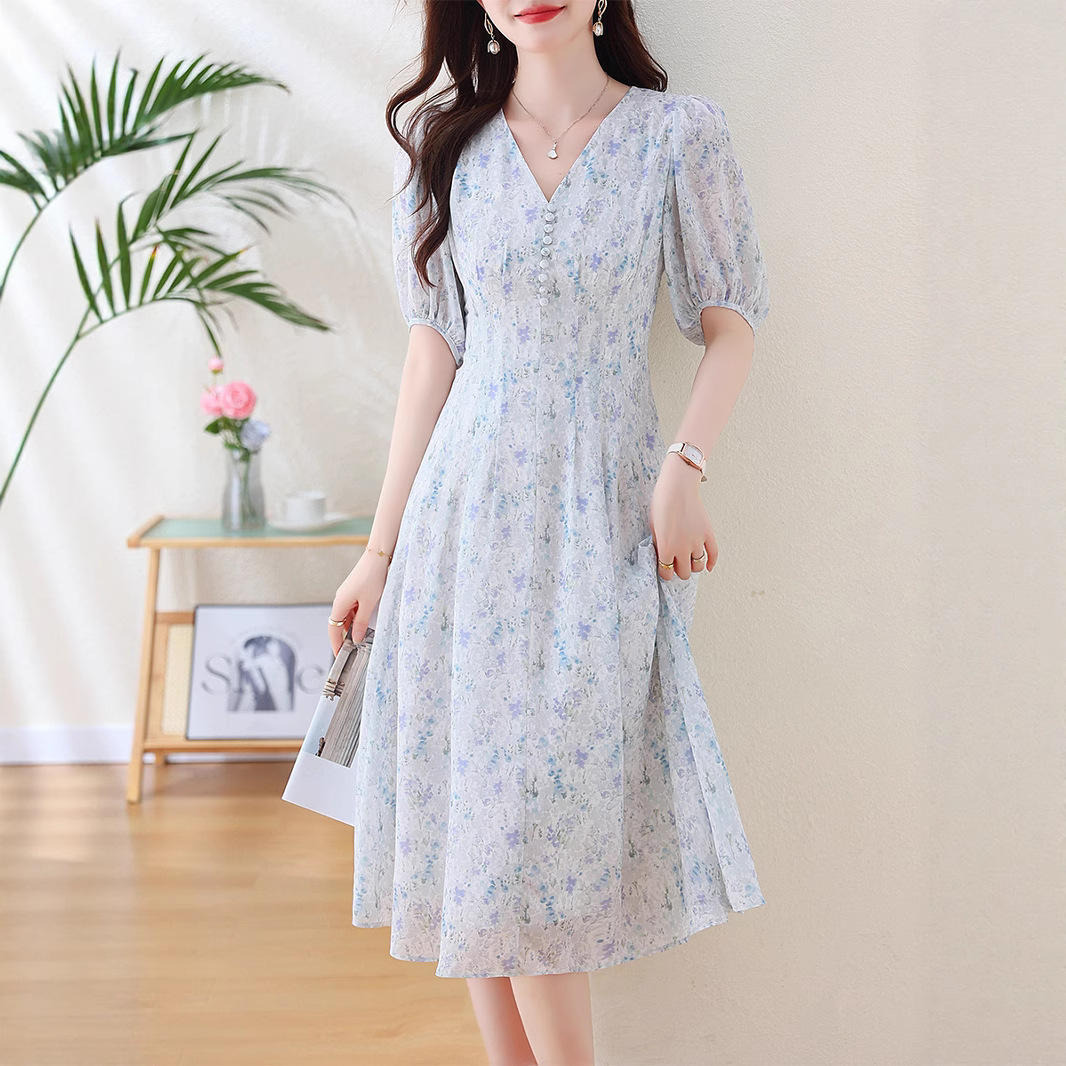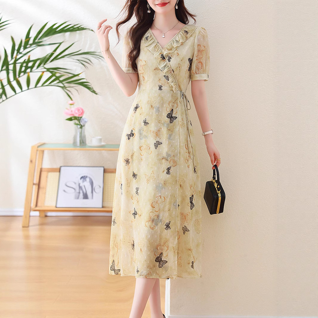 hmwl9970 フレンチティーブレイク花柄スカート 2025 夏の新しい気質 V ネックシフォンフリルスリーブドレス女性のための