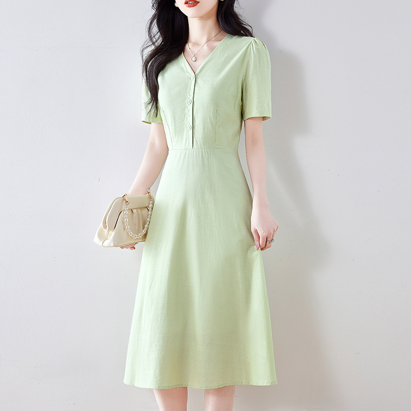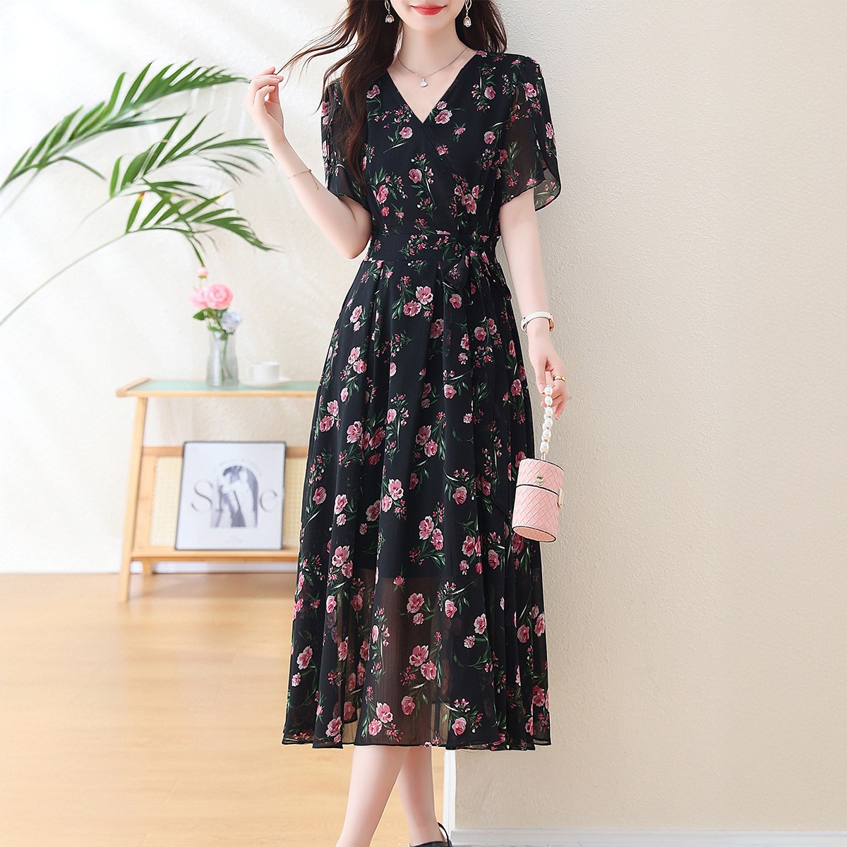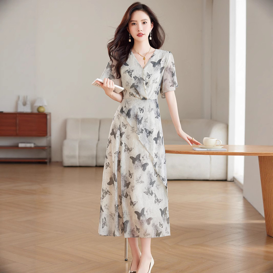 hmwl9970 フレンチティーブレイク花柄スカート 2025 夏の新しい気質 V ネックシフォンフリルスリーブドレス女性のための