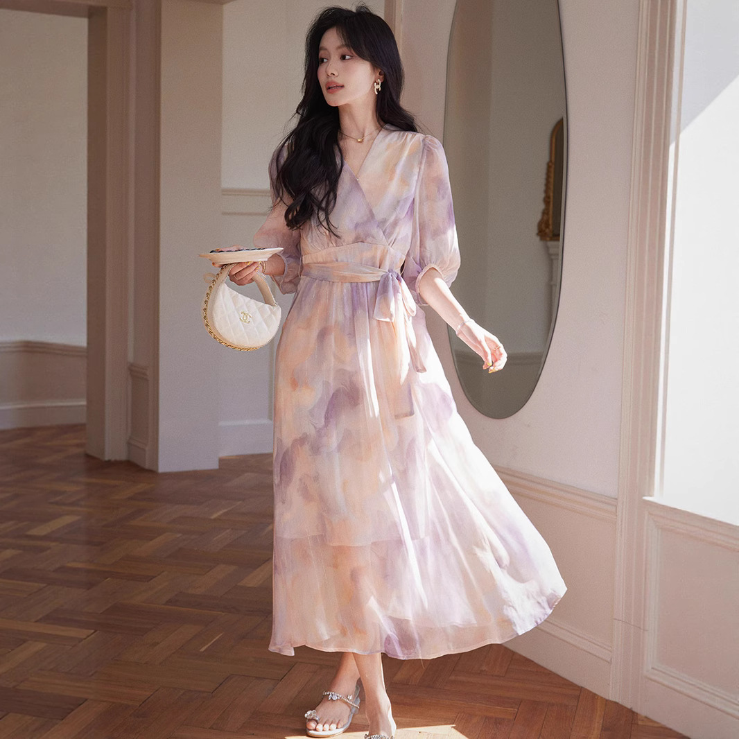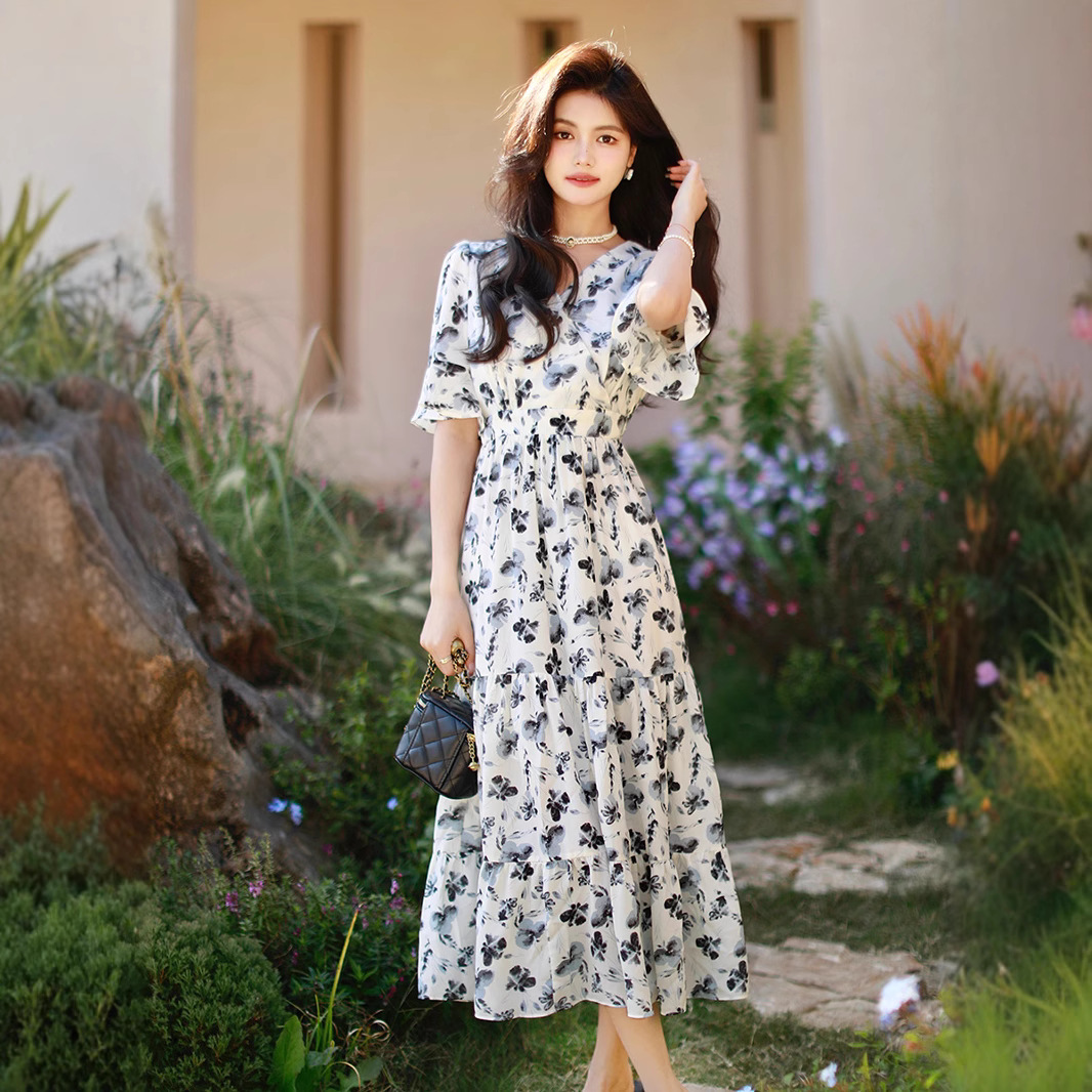 hmwl9979 ティーブレイクフレンチシフォン花柄ドレス女性の 2025 夏気質 V ネック海辺休暇ロングドレス