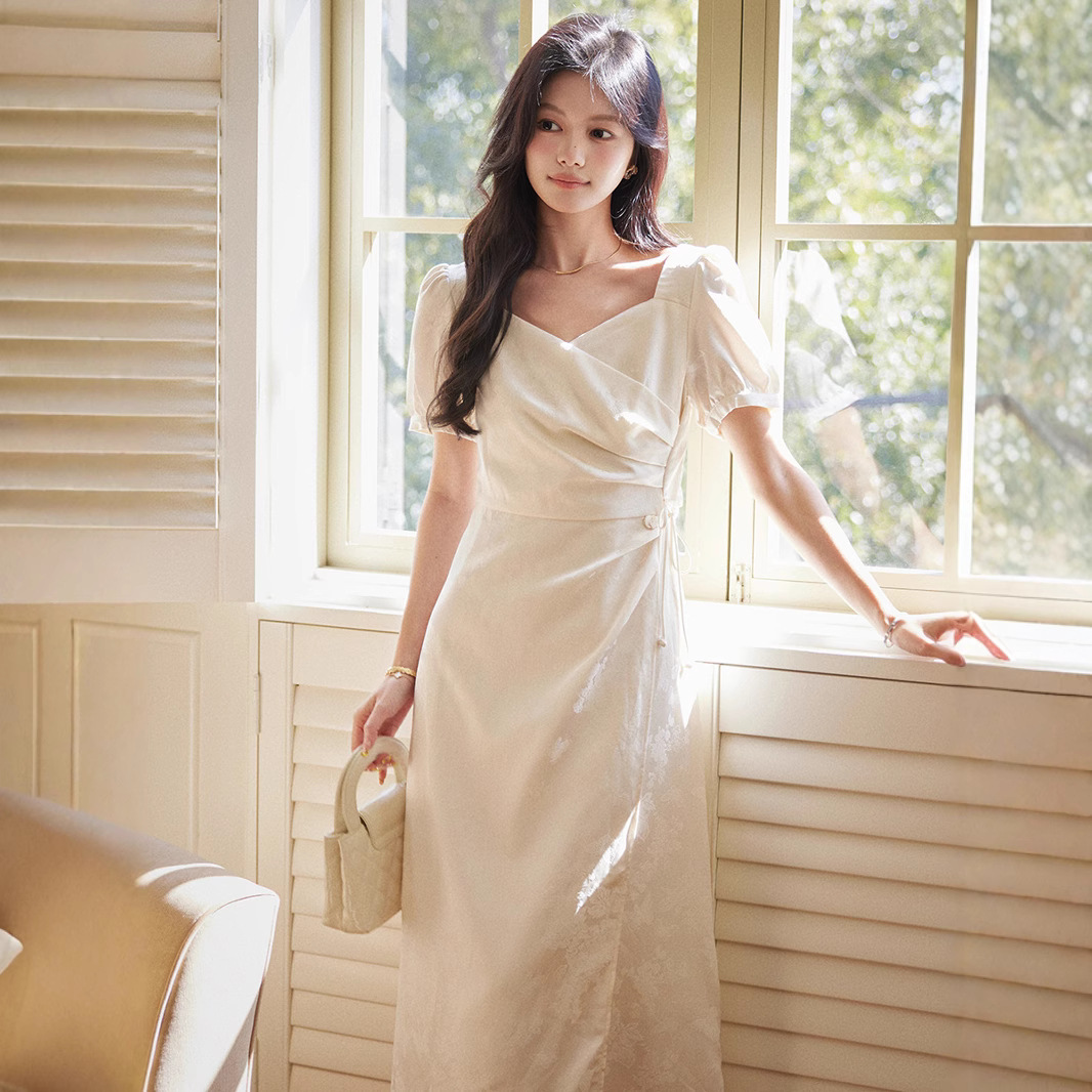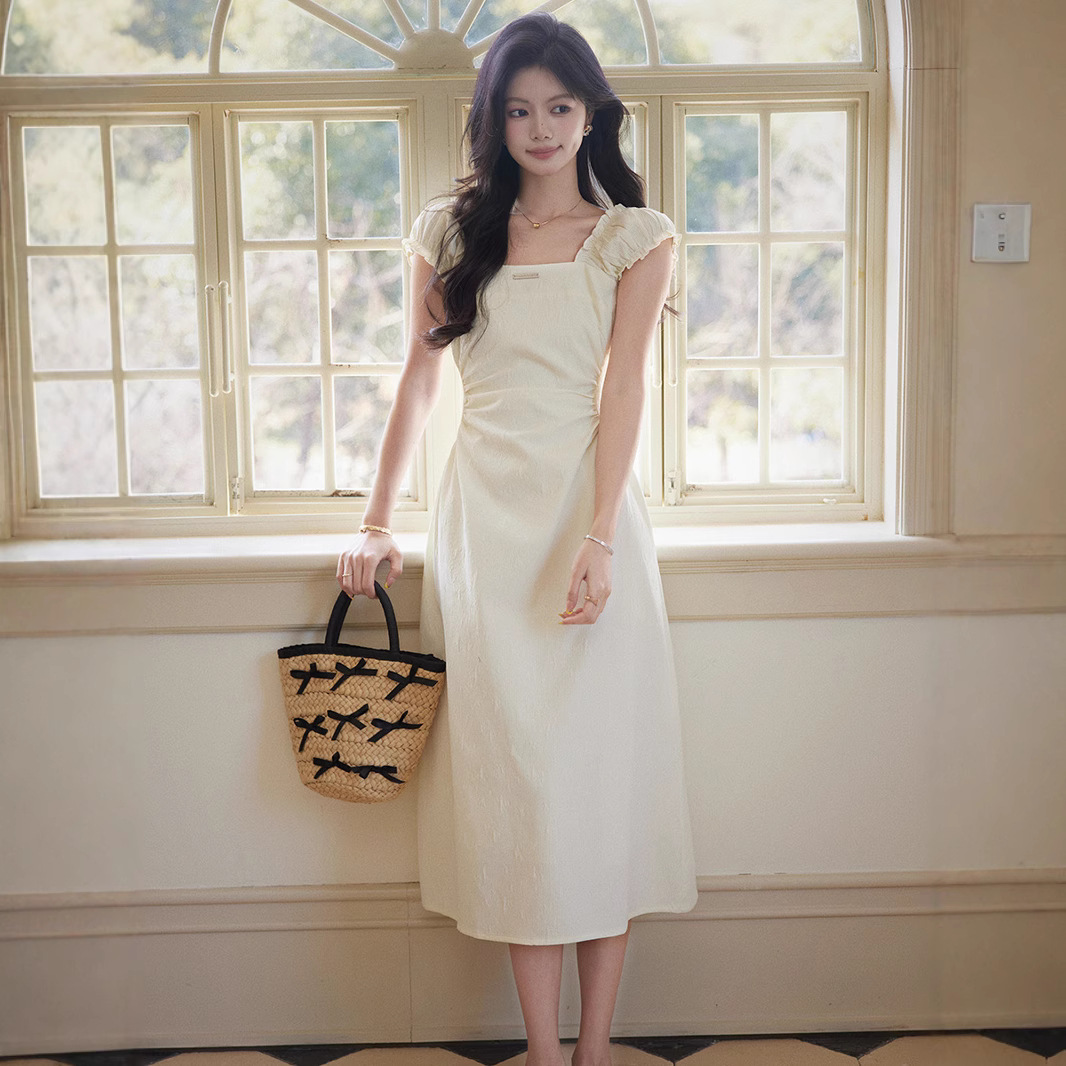 hmwl9026 ファッション気質白ドレス女性 2025 夏の新フレンチスクエアカラーウエスト痩身ロングスカート
