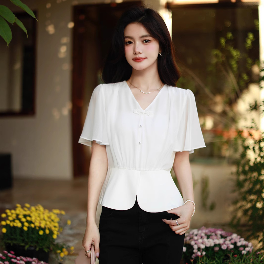 hmwl9939 Xiaoxiangfeng バックル V ネック半袖シフォンシャツ女性のための 2025 夏の新しい中国風スリムスタイルシャツ