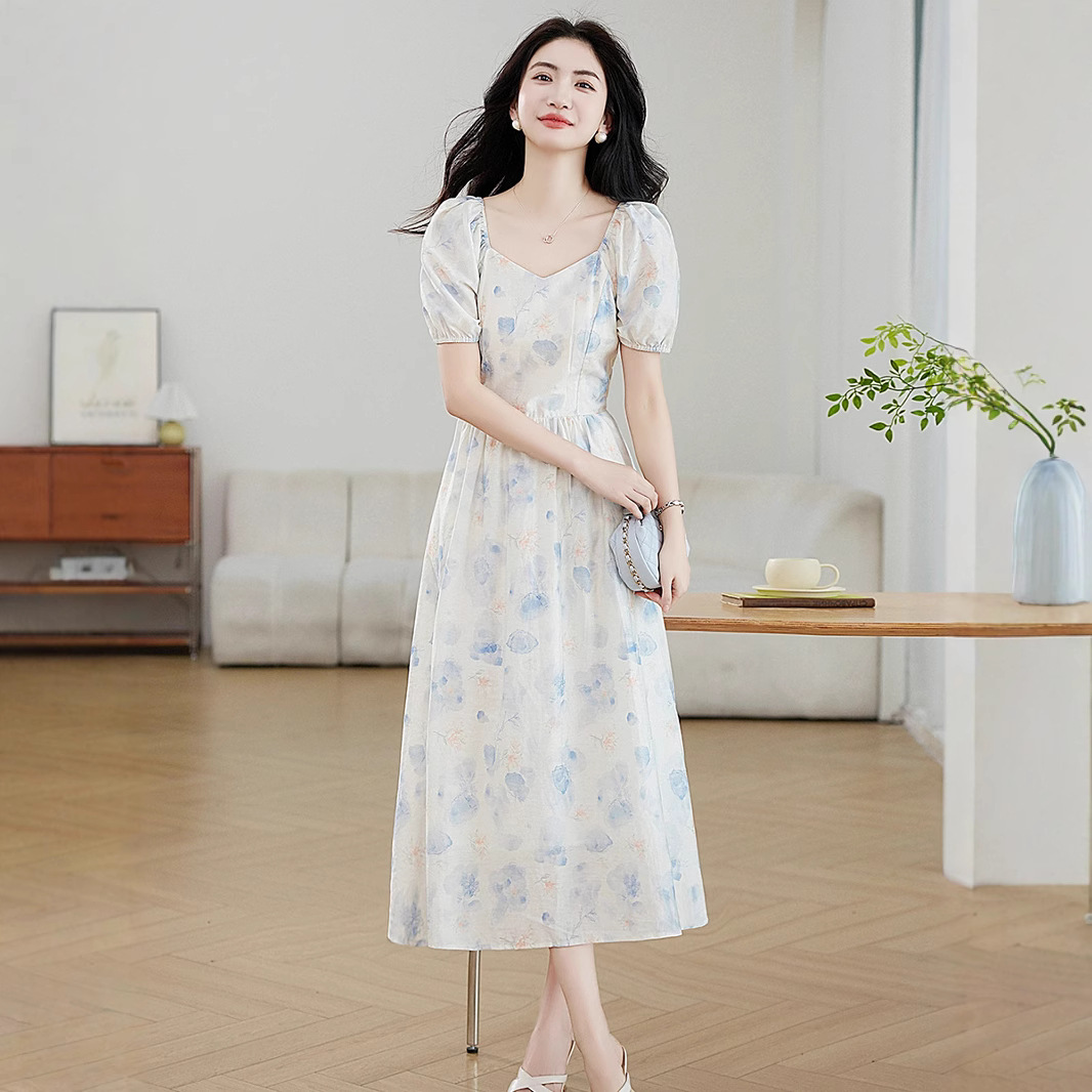 hmwl9030 ファッション花柄ドレス女性 2025 夏新フレンチスクエアカラーパフスリーブブルーロングドレス