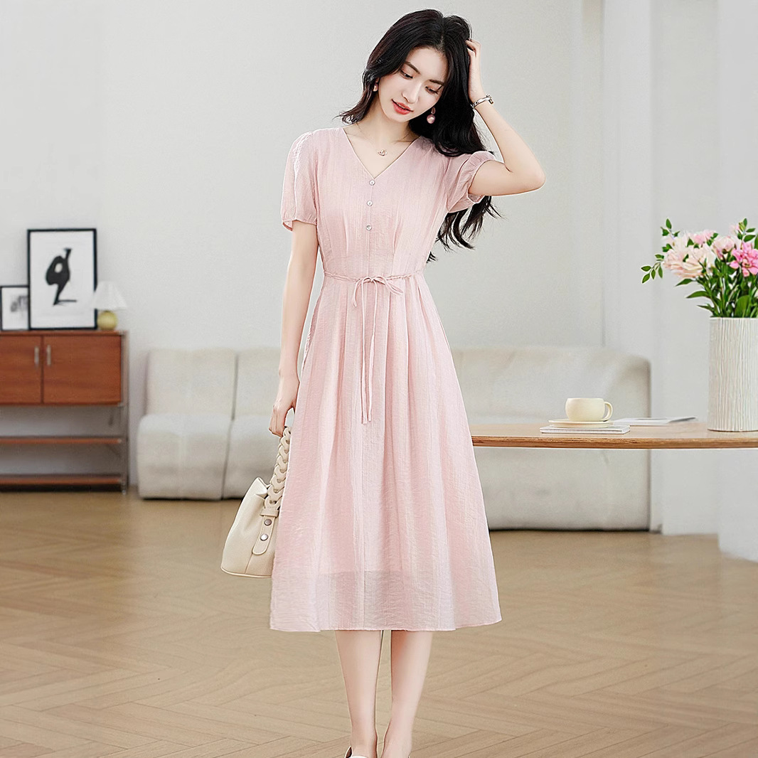 hmwl9032 フレンチスイートドレス 2025 夏新作 V ネックハイエンドピンクウエストスカート