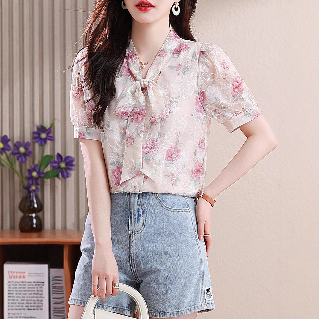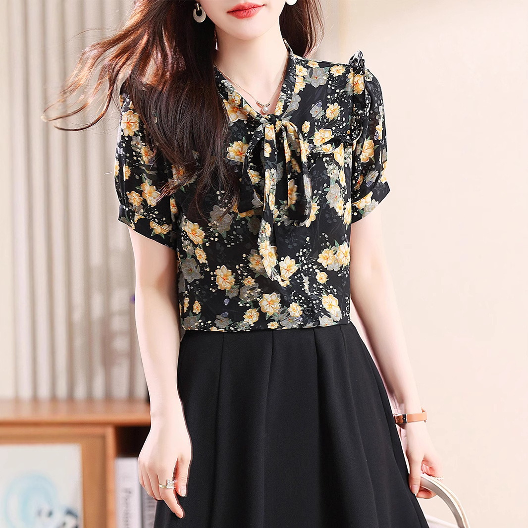 hmwl9956 花柄シフォンシャツ女性の 2025 夏の新しいスタイルのリボン気質 V ネック半袖薄手のトップ