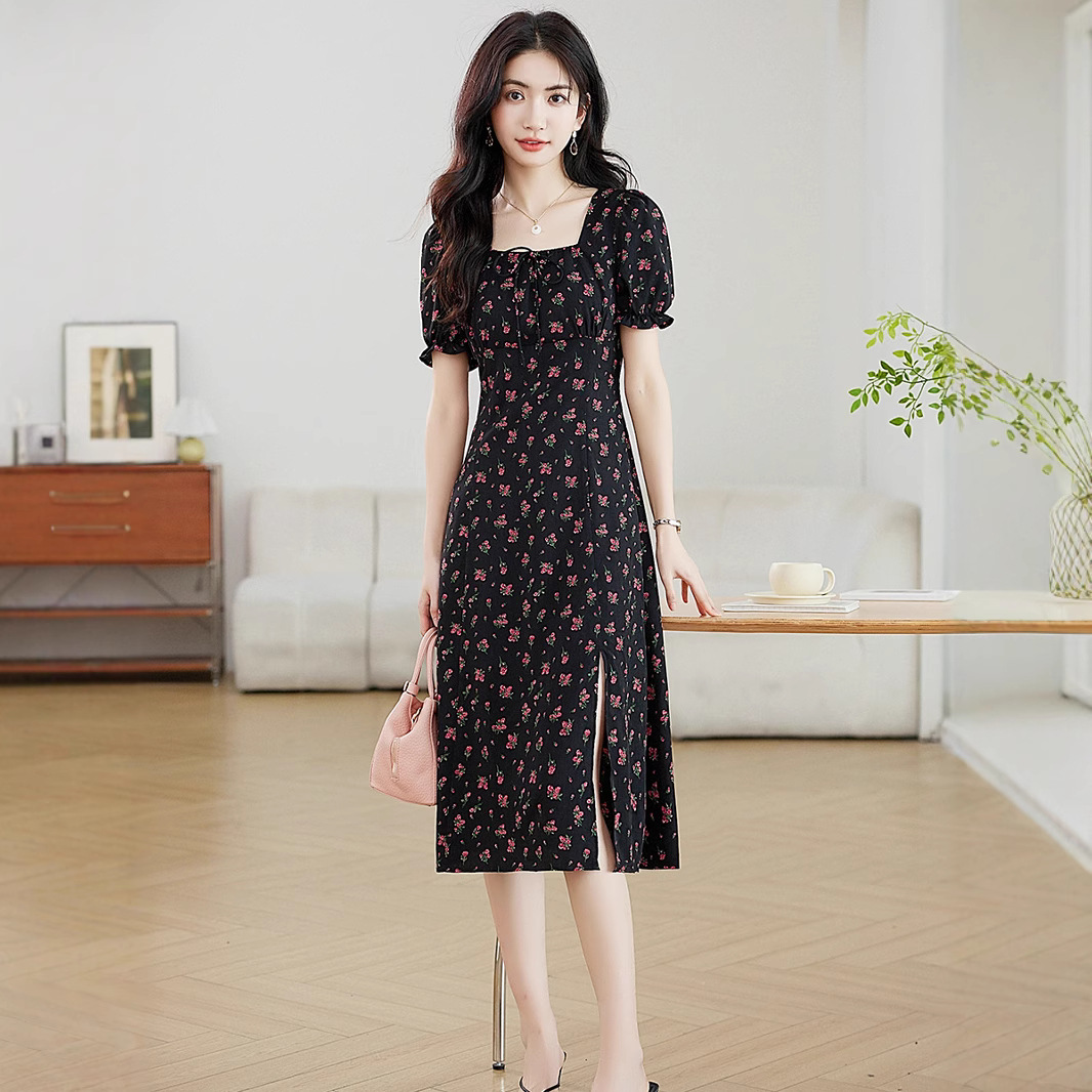 hmwl9050 フレンチレトロ花柄ウエストスリットドレス 2025 夏の新しい気質パフスリーブスカート