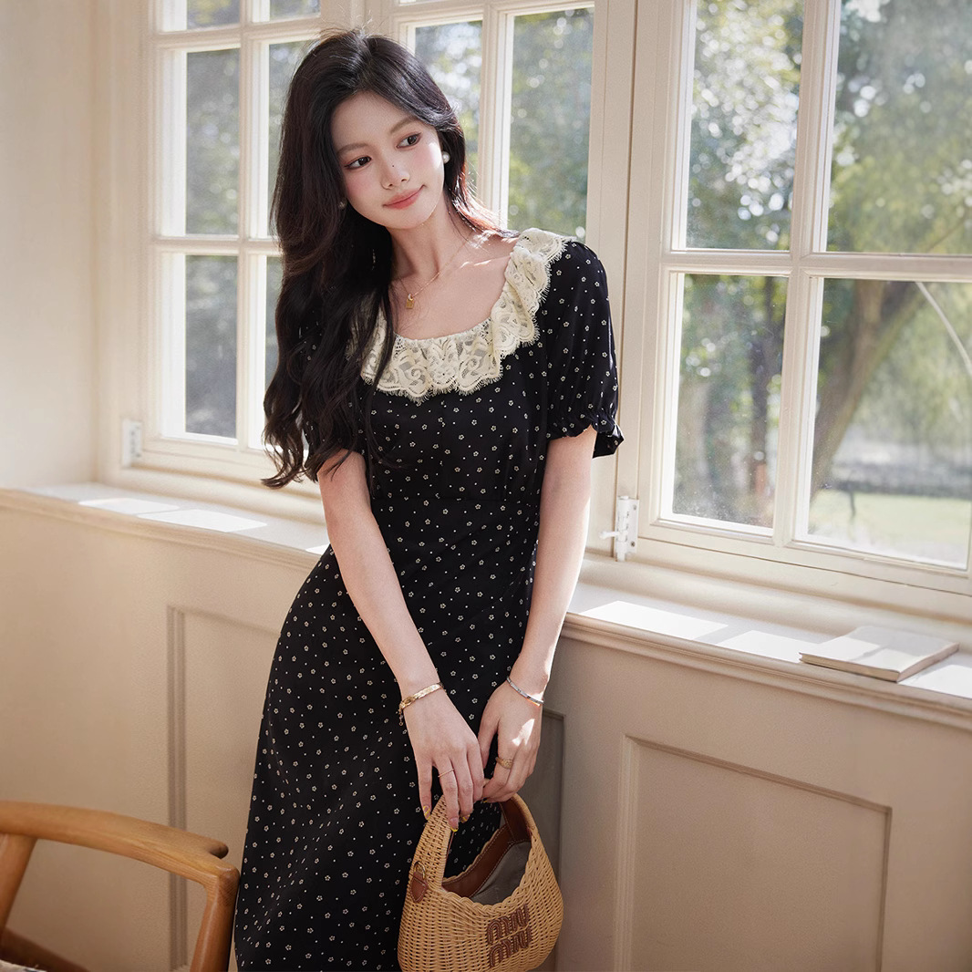 hmwl9012 ヘプバーンスタイル黒花柄ドレス女性 2025 夏新ファット mm フレンチスリムスカート